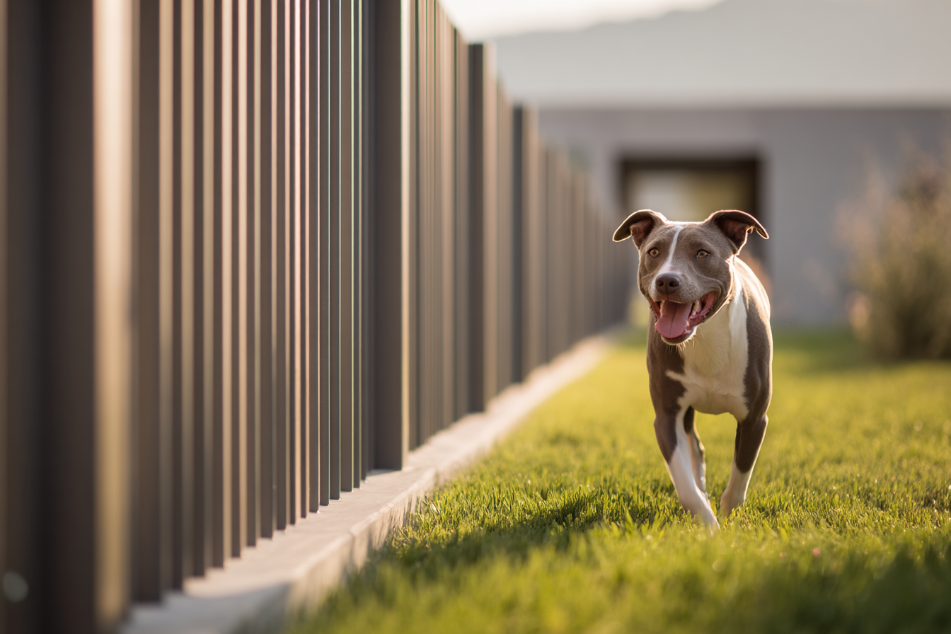 Metalowe sztachety dają tu ogromne możliwości, ponieważ odstępy między profilami można precyzyjnie dobrać do potrzeb konkretnego zwierzęcia. Psy spokojne, które nie reagują nadmiernie na bodźce, mogą dobrze funkcjonować przy ogrodzeniu o większym prześwicie – lekka konstrukcja dodaje ogrodowi przestrzeni i naturalności. Jednak w przypadku psów bardziej czujnych, terytorialnych lub reaktywnych warto postawić na węższe odstępy. Ograniczenie widoczności nie tylko zmniejsza liczbę bodźców, ale także obniża poziom stresu i zapobiega nadmiernemu pobudzeniu, co pozytywnie wpływa na codzienne zachowanie psa.